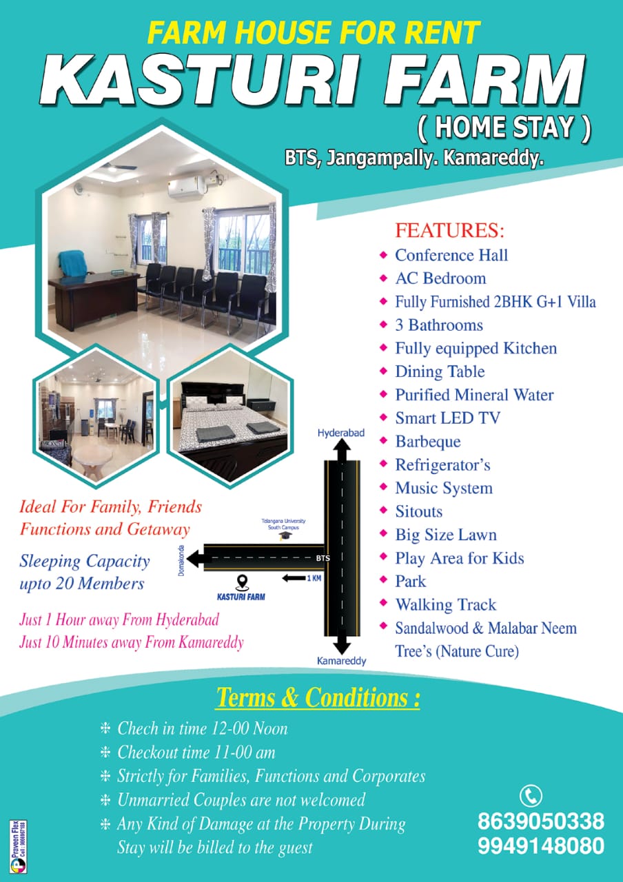 PER ACER 3.6CR Farmhouse for SaleNear to NH-44 before Kamareddy 100fts BT Road Facing.DTCP APPROVED LAYOUTIn a peaceful environment free from any pollution,Amidst the beauty of green nature...SANDALWOOD, malabar neem trees,A modern setting amidst flowers and fruit trees.Spacious enough for 300 guestsAlong with accommodation, AC for your family. Unique place with Rooms (Villa).Surrounding Fencing, Entrance Arch with Gate, Security, Block Top Roads, Children's Play Area, Ample Parking Ahead..Kasturi Farm's Specialties:1. Huge bulk of SANDALWOOD & Malabar Neem Plantation grown over 5 years.2. 100 feet BT Road facing Near NH-44 Highway3. Total 3.20 Acres4. DTCP APPROVED LAYOUT5. 500 White Sandalwood trees6. 800 Malabar Neem Trees7. 100 Fruit Plants8. Full Water Available9. Total Drip System10. G+1 FULLY FURNITURE in 300 sq. yards VILLA A/C11. BANK FACILITY AVAILABLEFor more info:Kasturi FarmsBTS Road, Jangampally, KamareddyCall: +91 9949148080Whatsapp: https://wa.me/qr/2BREHWG5NYC3A1Direction: https://maps.app.goo.gl/siTMHGnTUoiVzKgD6https://youtu.be/NqLF6IXoQo4?si=Bl259uuFV35Z5pvE PLEASE GO THROUGH THE LINK