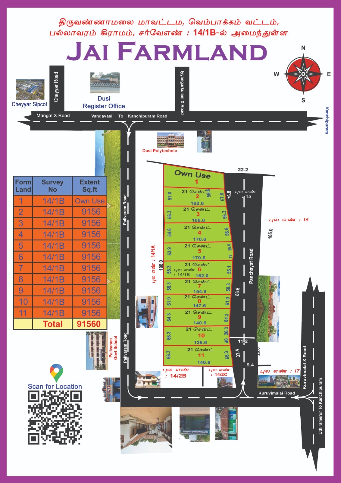 21 Cents Farmland Near Kanchipuram – ₹36.6 LakhsJust 10 minutes from Kanchipuram.At JAI Farmland, you get a ready farm estate with 78 trees (Mango, Coconut & Medicinal plants).Price is just ₹400 per sq.ft.Nearby layouts sell at ₹1,000 per sq.ft.2 years free maintenance.24/7 security, CCTV, and solar street lights.Located near Aingaarkulam Kootroad.10 minutes to Cheyyar SIPCOT.Only 11 plots available.Pay 20% advance and get Free Registration.Contact: 99943 31913